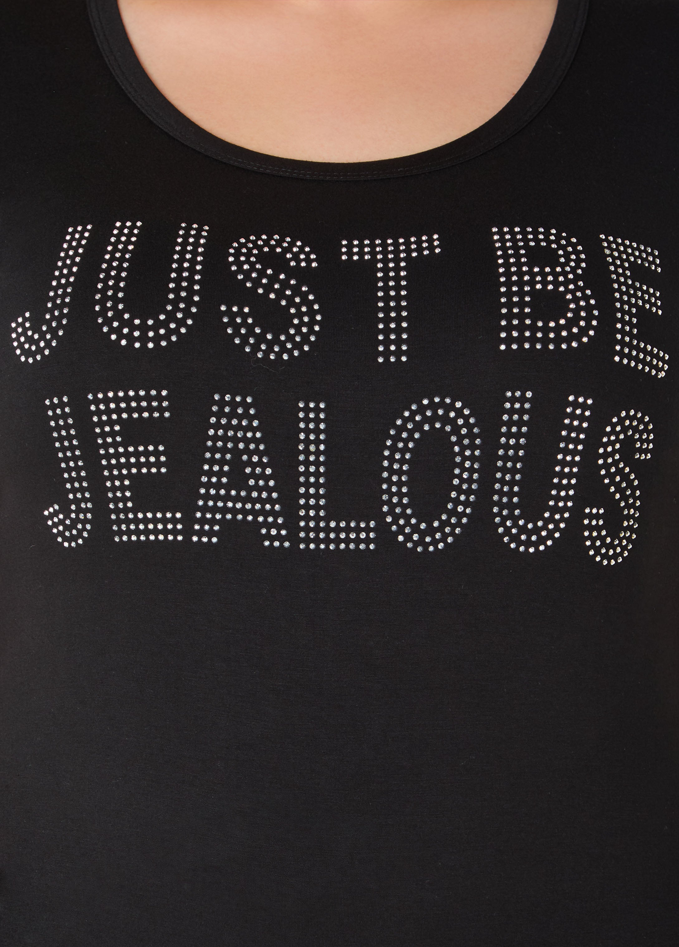 Cute, comfy and a little bit audacious. This stretch-knit tee is full-blown baddie aesthetic with crystal lettering that says "Just Be Jealous" & means it. Soft, curve-loving fabric meets unapologetic sparkle for a look that shines without asking for permission.